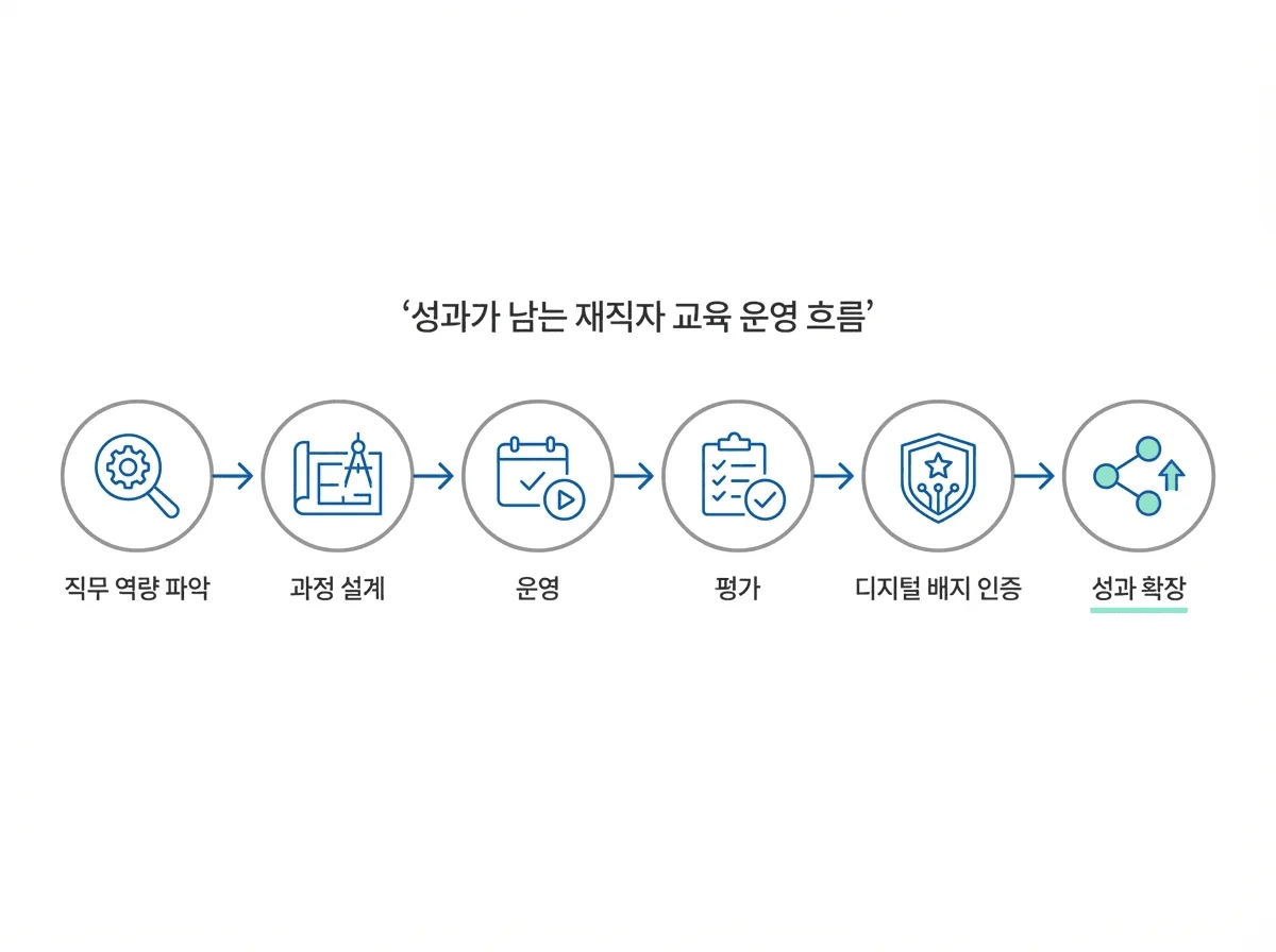 직무역량 도출 → 과정 설계 → 운영 → 평가 → 인증(디지털 배지) → 성과 확산까지 일관된 흐름이 요구됩니다.