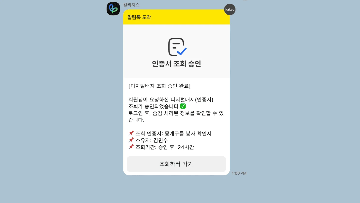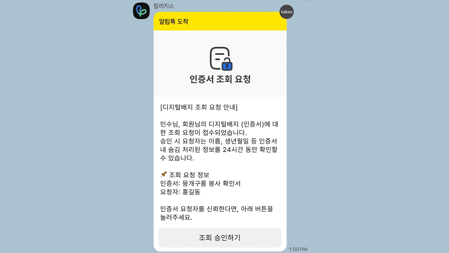 제3자가 인증서에 포함된 가명처리 정보를 조회하고자 요청하면, 수령자는 인증서 조회 요청 알림톡 에서 해당 해제 요청을 승인하거나 거절할 수 있습니다.