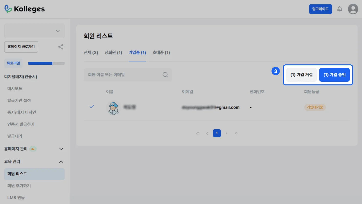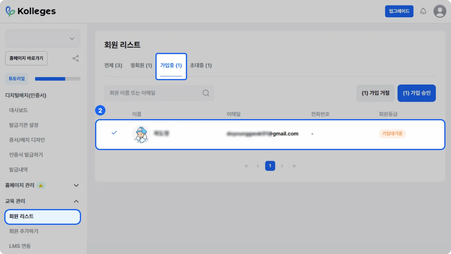 [교육 관리] > [회원 리스트] > [가입중]탭에서 가입 요청을 한 회원 리스트를 확인합니다.