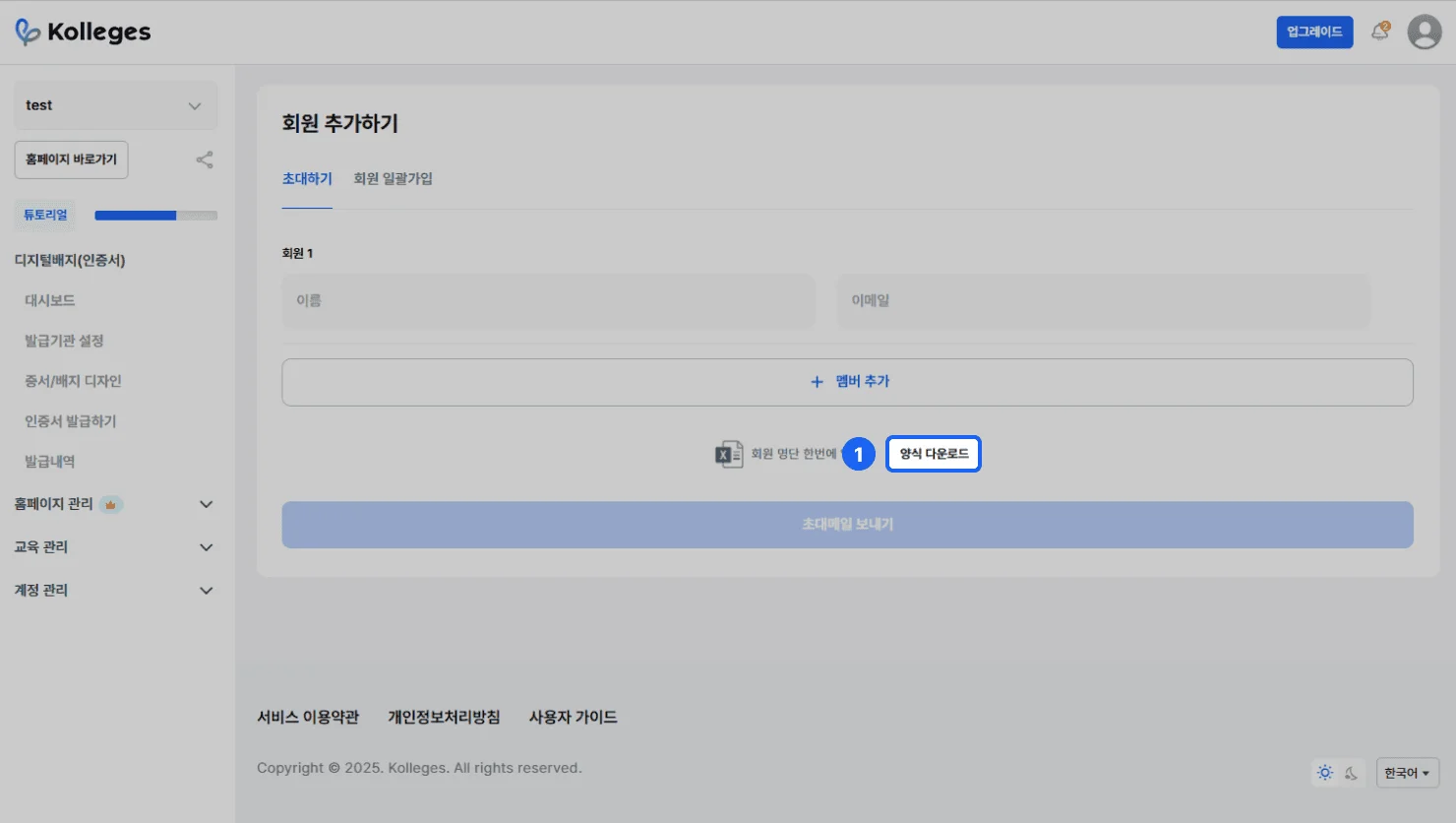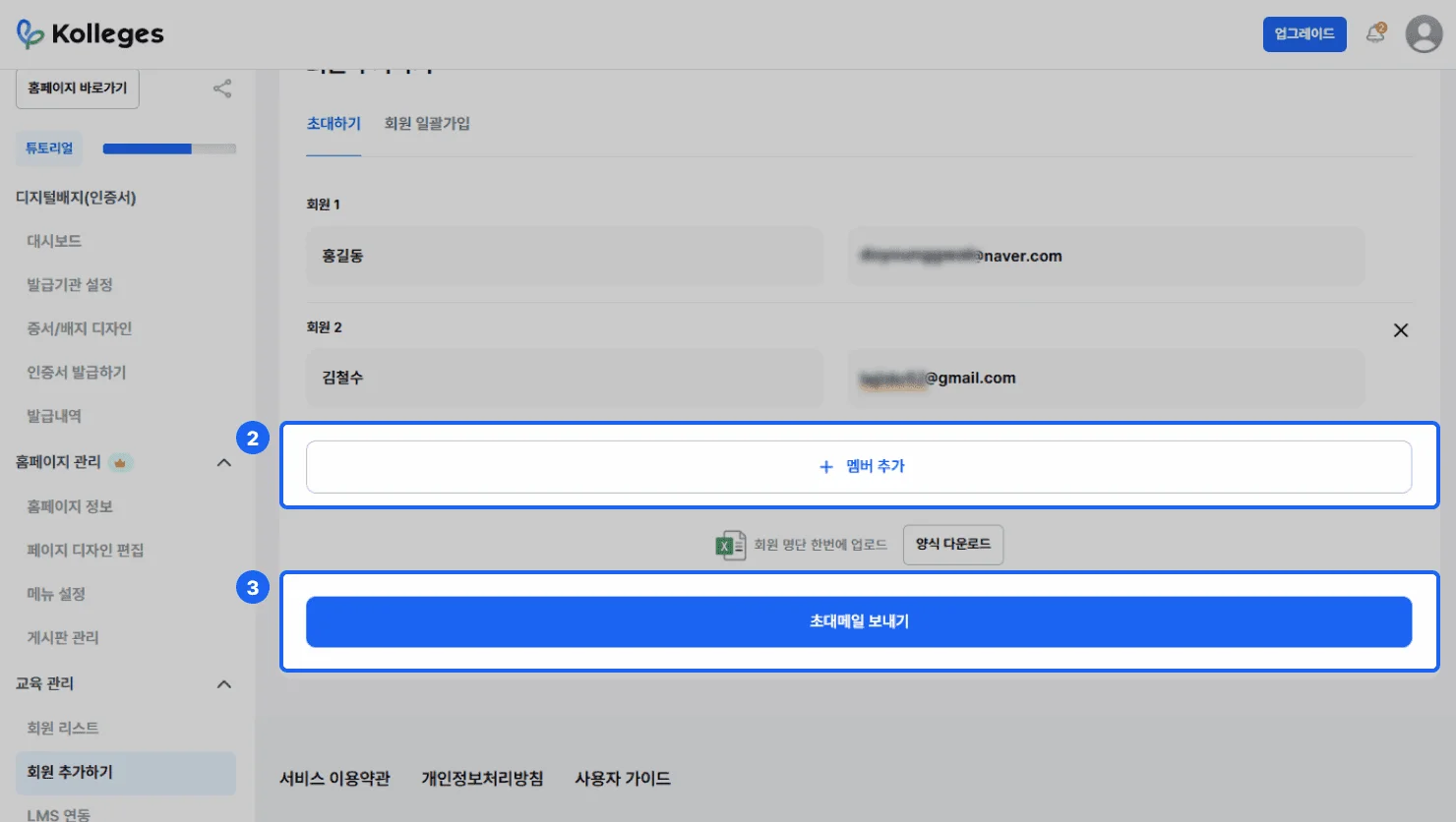[교육 관리하기] > [회원 추가하기] 페이지에서 추가할 멤버의 이름 및 이메일 정보를 입력합니다.