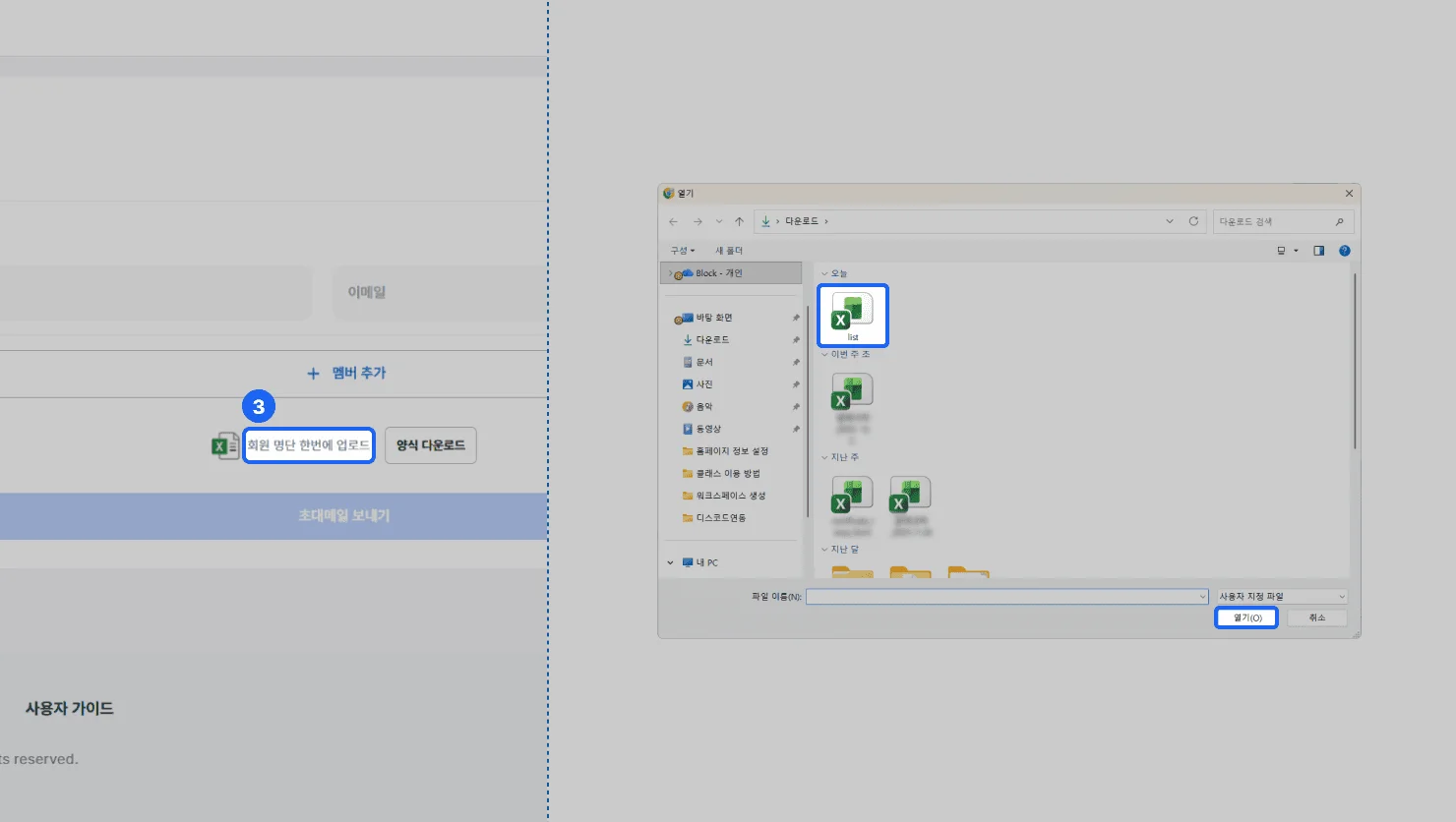 {회원 명단 한번에 업로드} 버튼을 클릭하여 작성했던 “list.xlsx” 파일을 업로드 합니다.