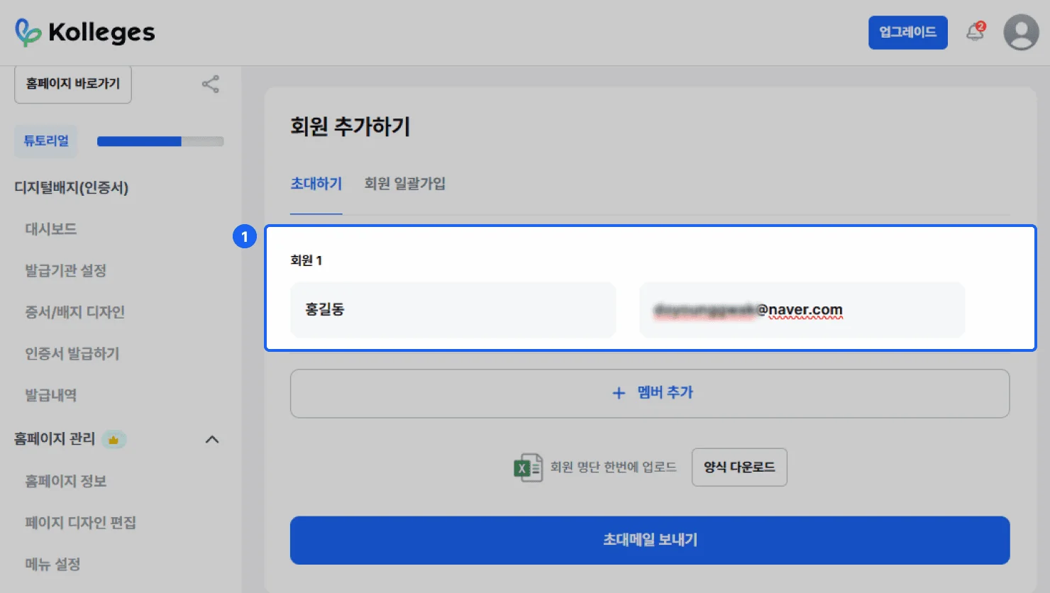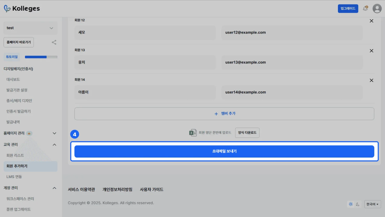 한번에 업로드된 회원 명단을 확인한 뒤, {초대메일 보내기} 버튼을 클릭하여 리스트에 작성된 회원 전원에게 초대메일을 발송합니다.