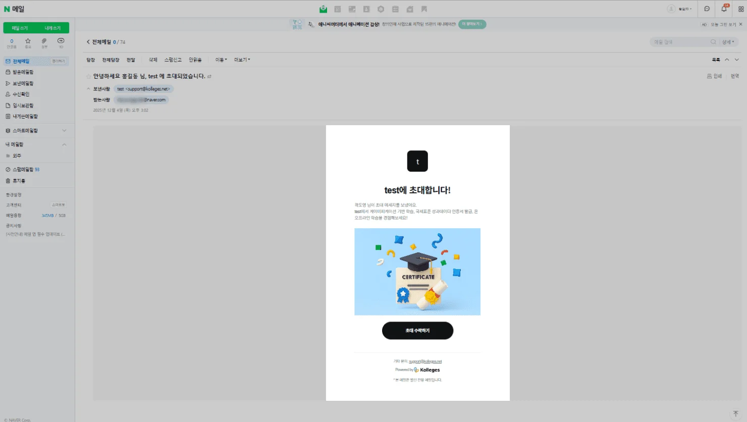 {초대메일 보내기} 버튼을 클릭하여 리스트에 작성된 회원 전원에게 초대메일을 발송합니다.