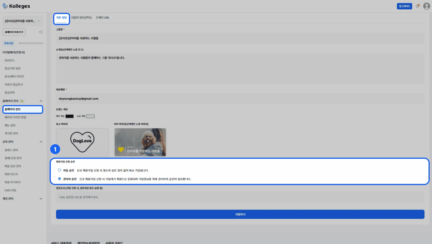 [홈페이지 관리] > [홈페이지 정보] > [기본 정보] 탭에서 회원가입 신청 승인 설정을 관리자 승인으로 설정 한 경우 사용자가 그룹에 가입하려 할 때, 해당 회원은 [회원 리스트]에서 가입중 상태가 됩니다.