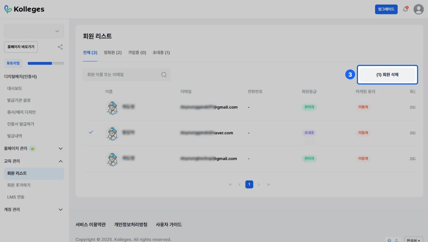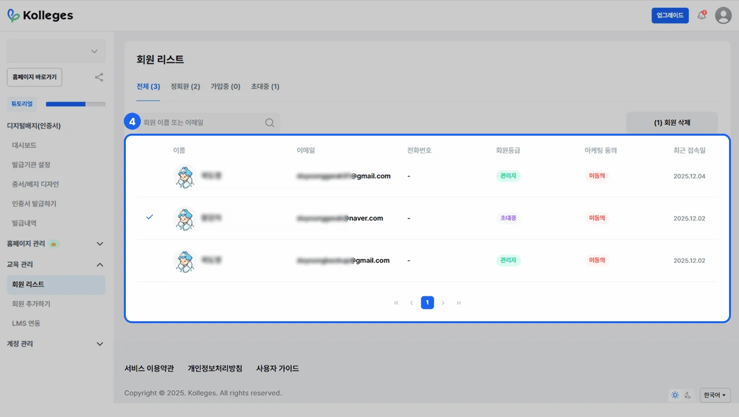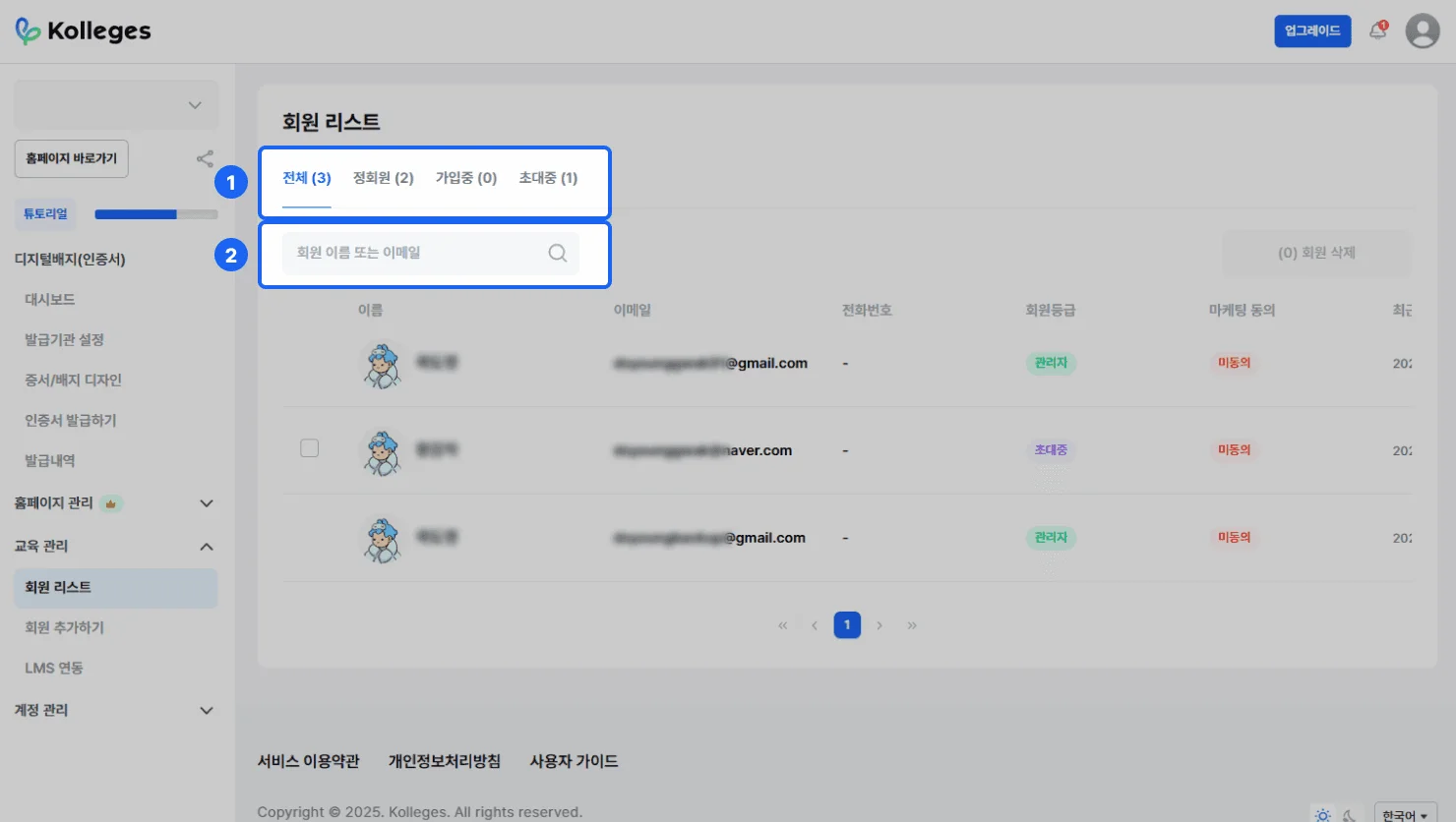 [교육 관리] > [회원 리스트]에서 정회원/가입중/초대중인 모든 회원을 확인할 수 있습니다.