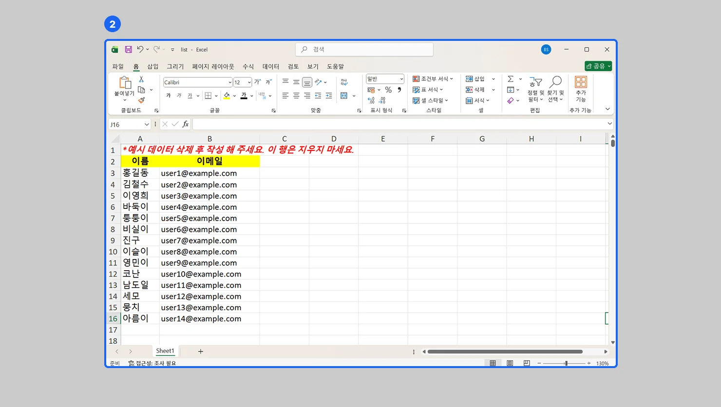 다운로드된 “list.xlsx” 파일을 열고, 해당 양식에 맞춰 회원 명단을 작성하여 저장합니다.