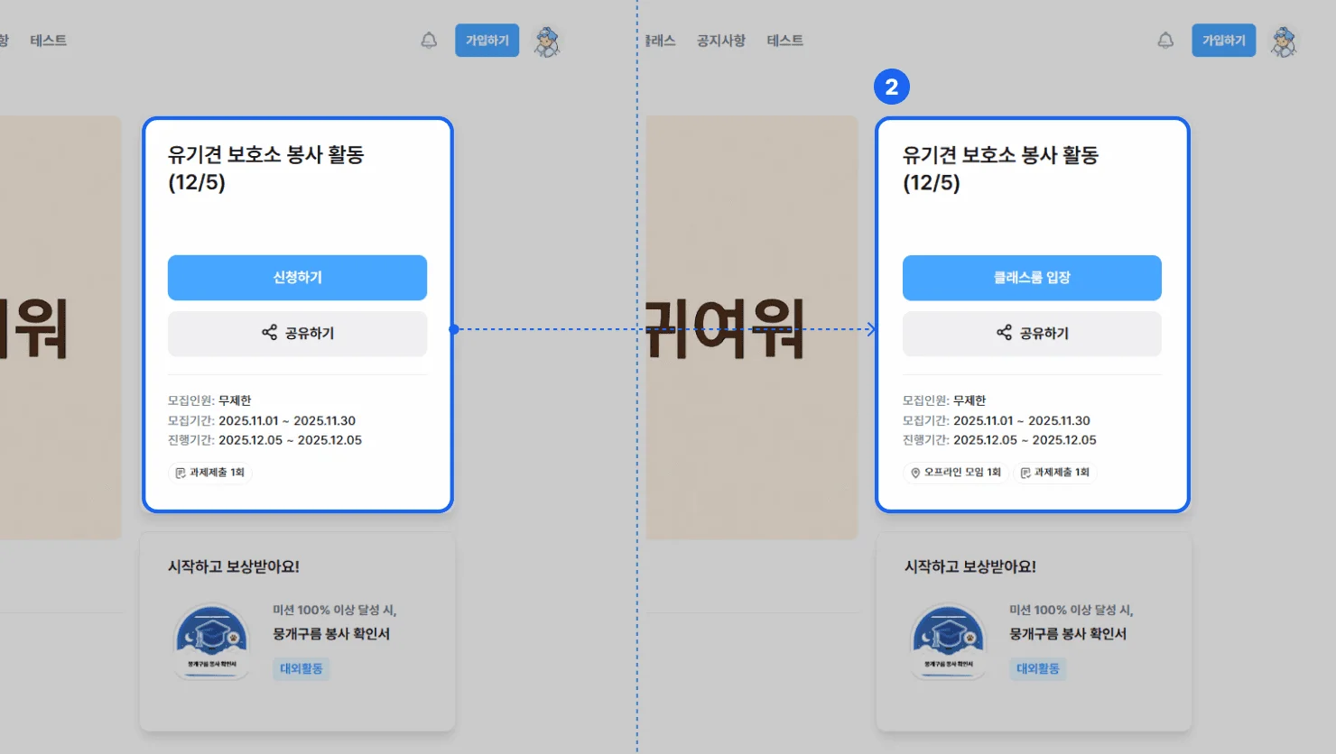 모집중인 클래스 리스트에서 참여하고 싶은 {클래스 카드}를 선택해 상세 페이지로 이동합니다.