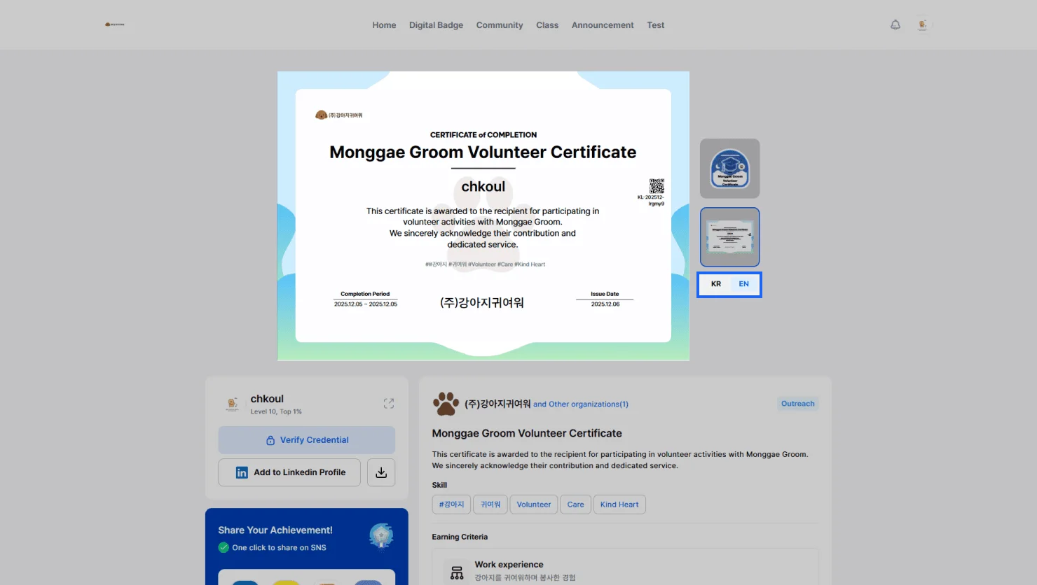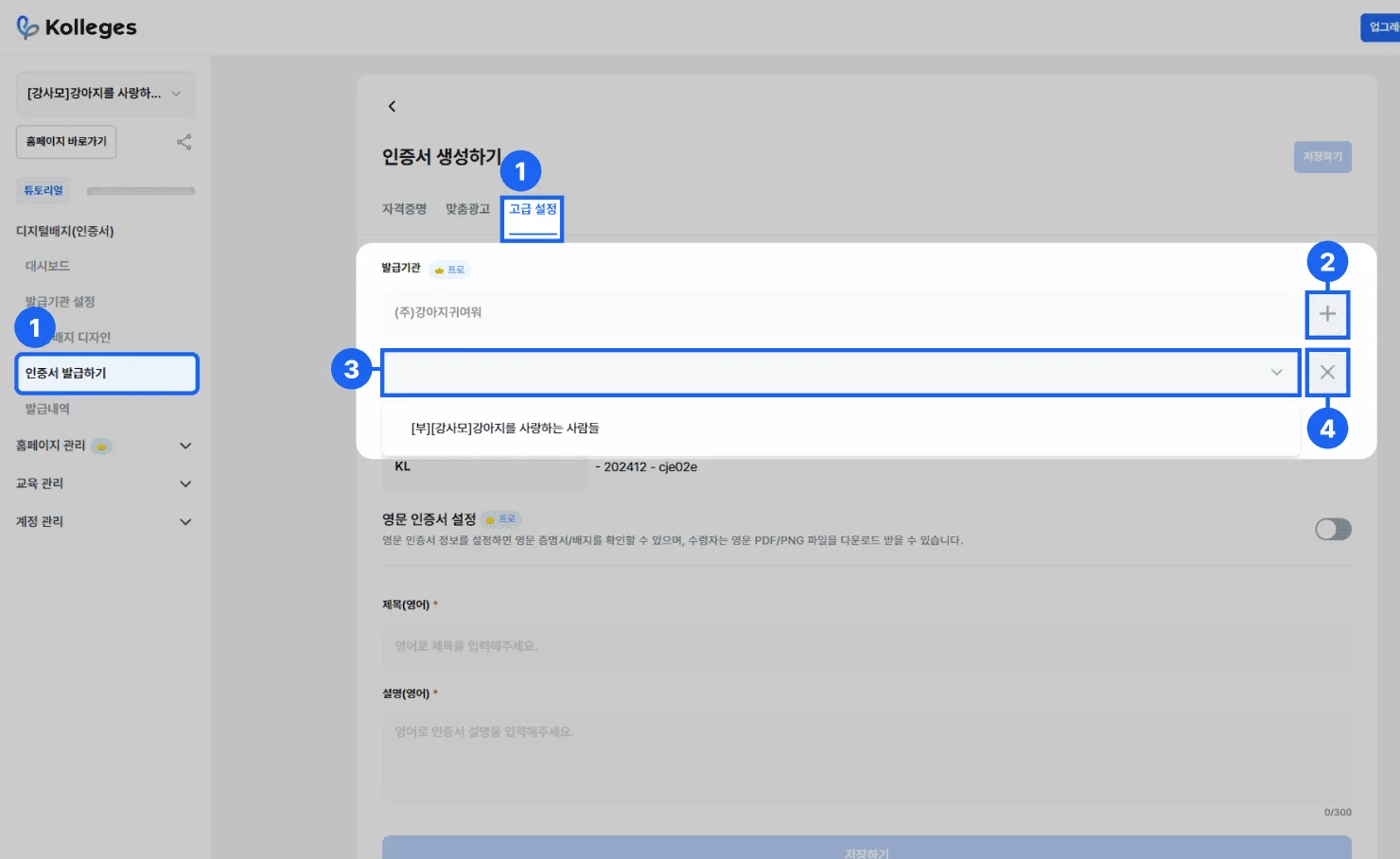 칼리지스에서는 국문 인증서뿐만 아니라 영문 인증서도 제작할 수 있으며, 해당 기능은 프로(Pro) 플랜부터 지원됩니다.