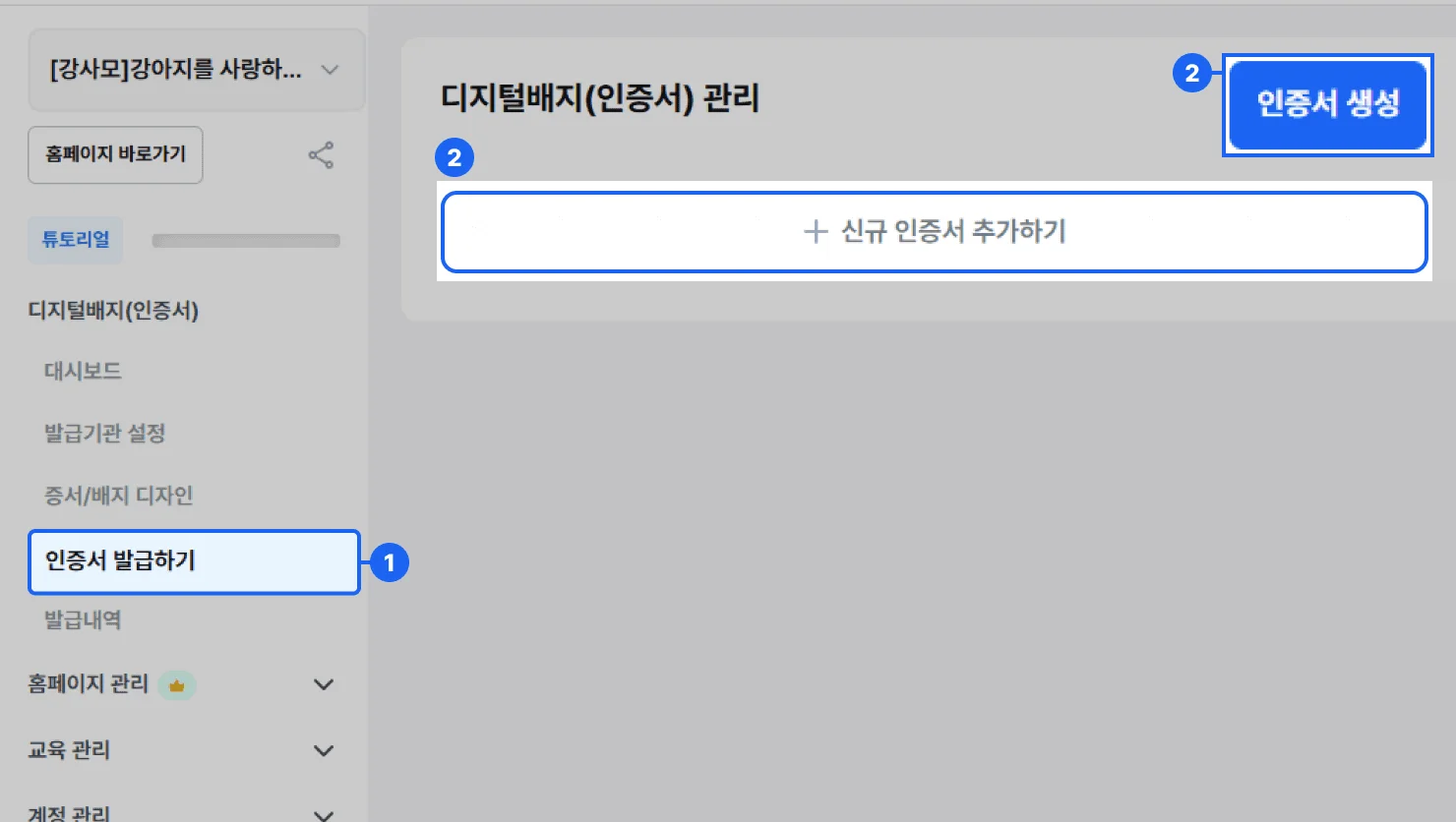 왼쪽 사이드 메뉴에서 [디지털배지(인증서)] > [인증서 발급하기] 메뉴를 클릭하여 [디지털배지(인증서) 관리] 페이지로 이동합니다.