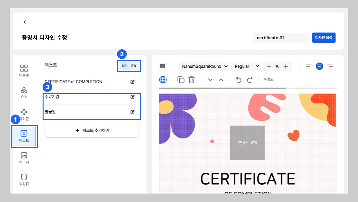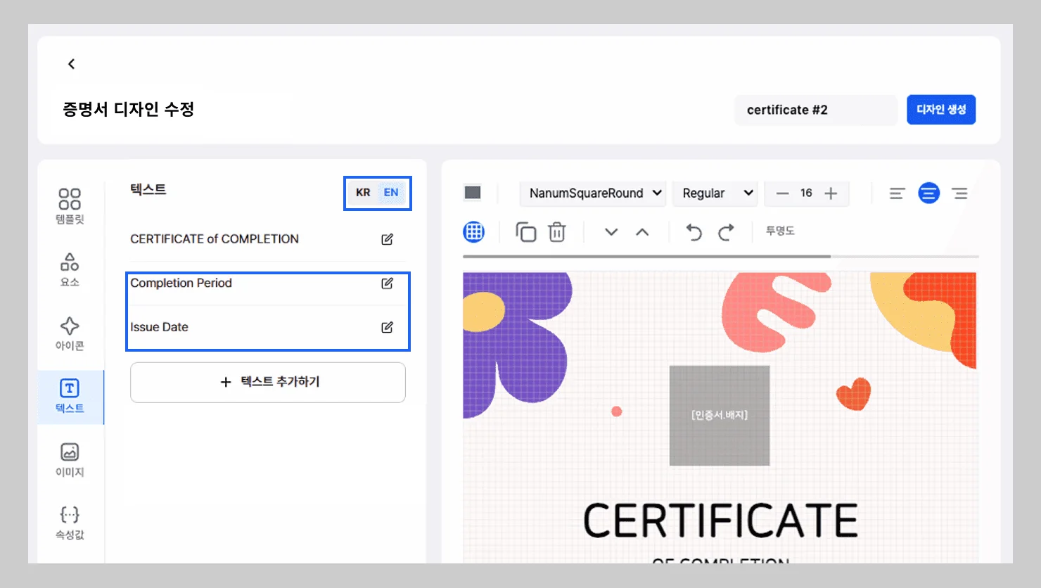 [증명서 디자인 수정] 화면 왼쪽 사이드 메뉴에서 {텍스트}를 클릭합니다.
