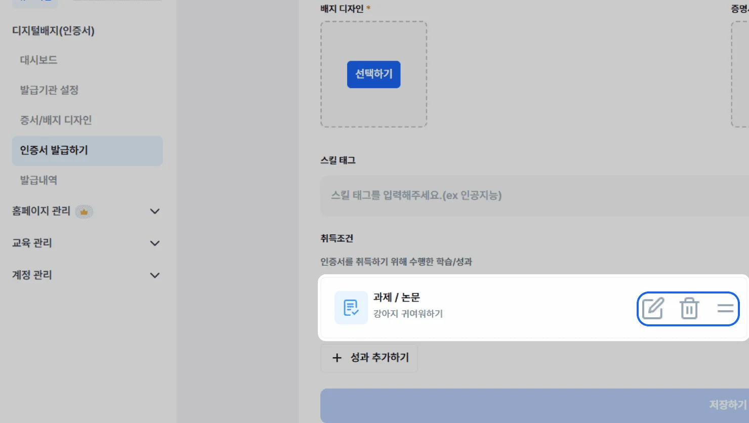 배지 및 증명서 디자인: [증서/배지 디자인] 메뉴에서 제작한 디자인을 선택합니다.