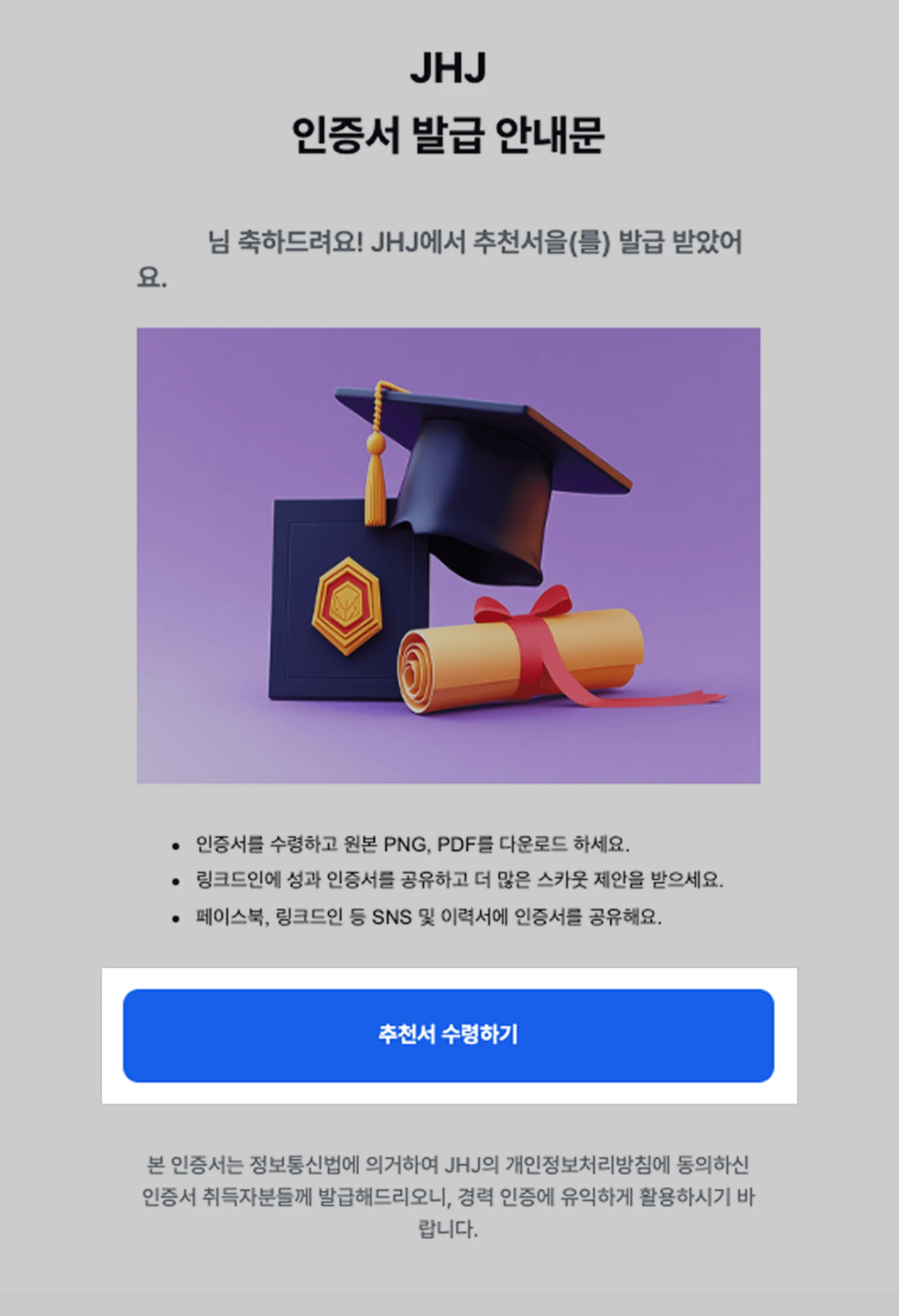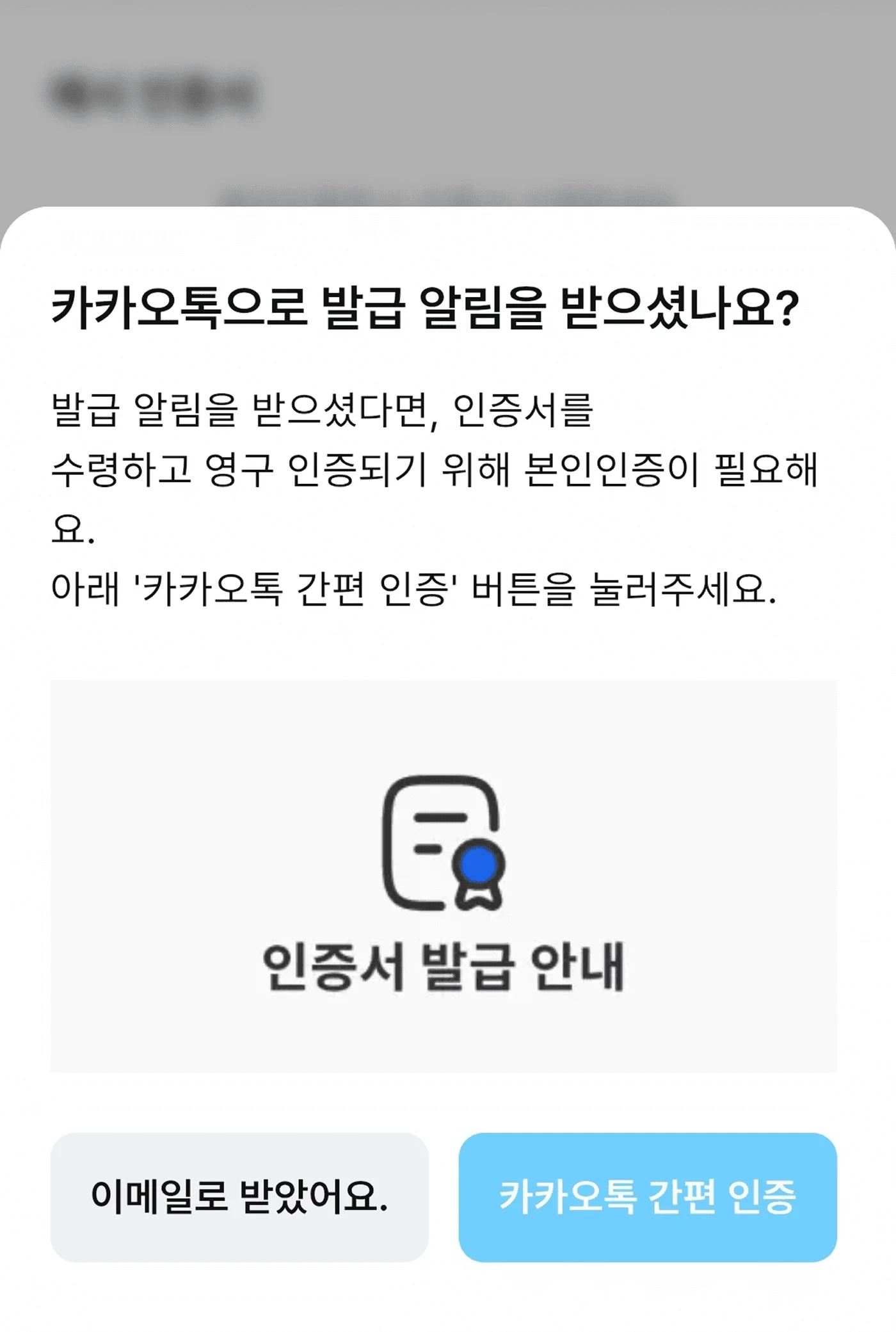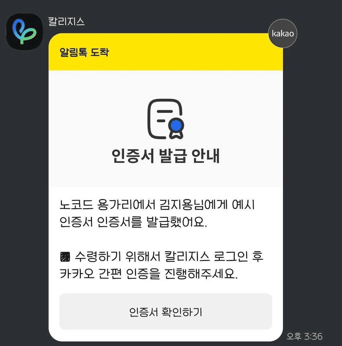 카카오톡 알림톡에서 [인증서 확인하기] 버튼을 클릭해 인증서 조회 페이지로 이동합니다.