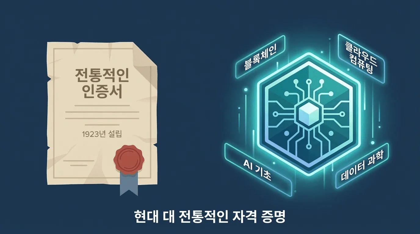 디지털배지 도입을 검토하는 대학에서 가장 자주 듣는 질문은 이것입니다. '기존 수료증을 디지털로 전환하면 되는 것 아닌가요?' 겉으로 보면 맞는 말처럼 보입니다. 둘 다 무언가를 완료했다는 표시이니까요. 하지만 바로 이 지점에서 방향이 갈립니다.