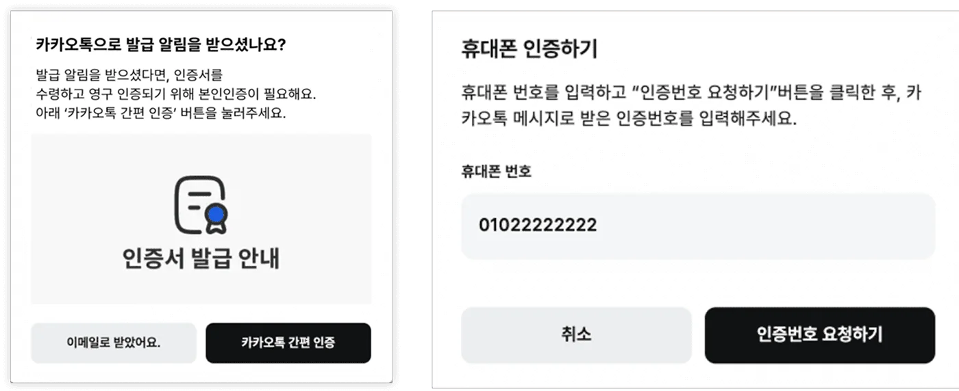 간편 인증을 완료하면 카카오 알림톡으로 받았던 인증서가 수령되는 것을 확인할 수 있습니다.