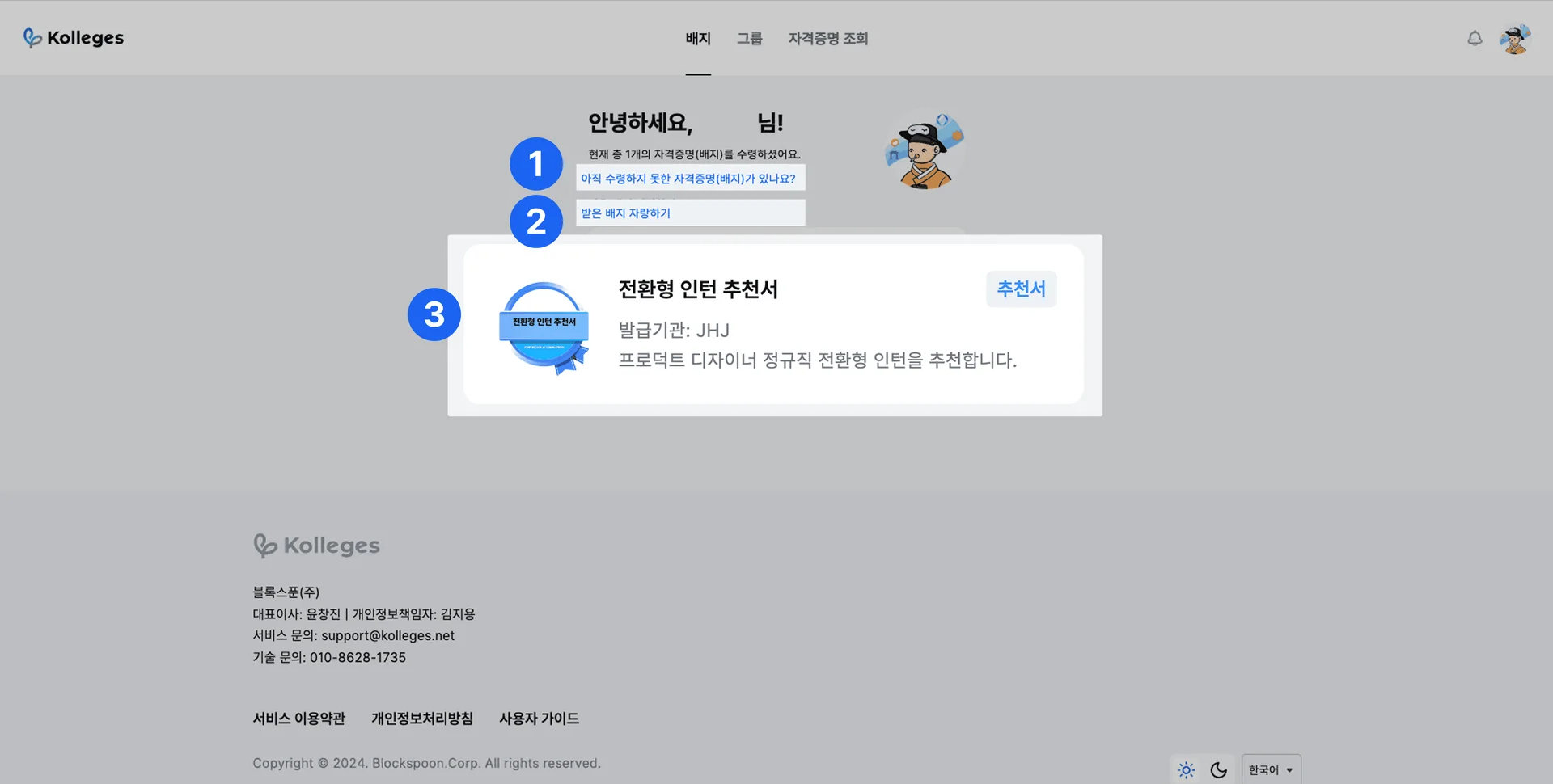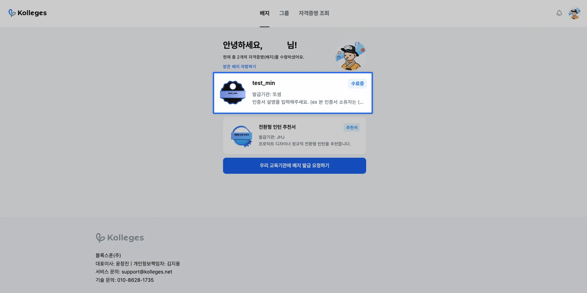 아직 수령하지 못한 자격증명(배지)가 있나요?: 휴대폰 번호로 수령 시, 인증서를 수령하고 영구인증되기 위해서 본인인증이 필요합니다.