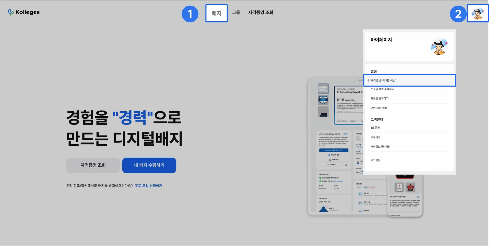 내 프로필을 선택하고 ‘내 자격증명(배지)지갑'을 클릭합니다.