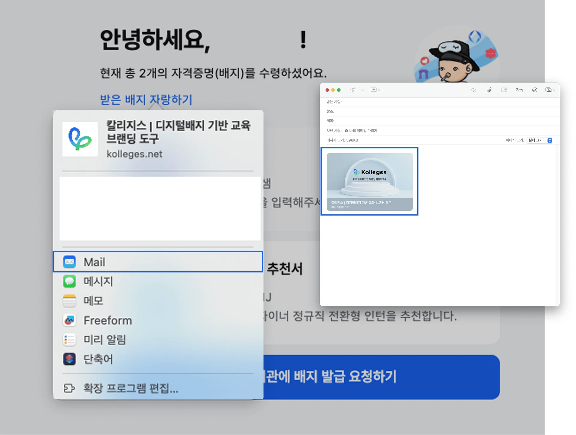 받은 배지 자랑하기를 클릭하면 메일, 메시지, 메모 등 선택한 방법에 공유 링크가 자동으로 입력됩니다.