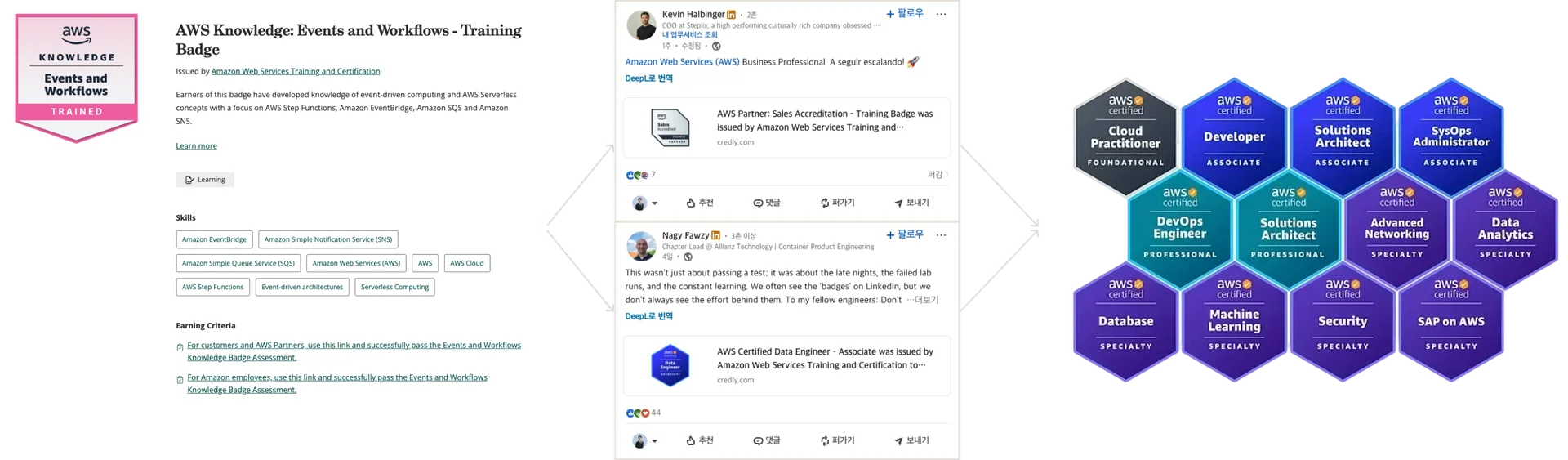 셋째, 국제 표준과 외부 플랫폼 연동을 전제로 설계했습니다. Credly 같은 검증 플랫폼, Open Badge 표준, LinkedIn 연동 — 이런 요소들이 배지의 신뢰도와 활용도를 근본적으로 높였습니다.