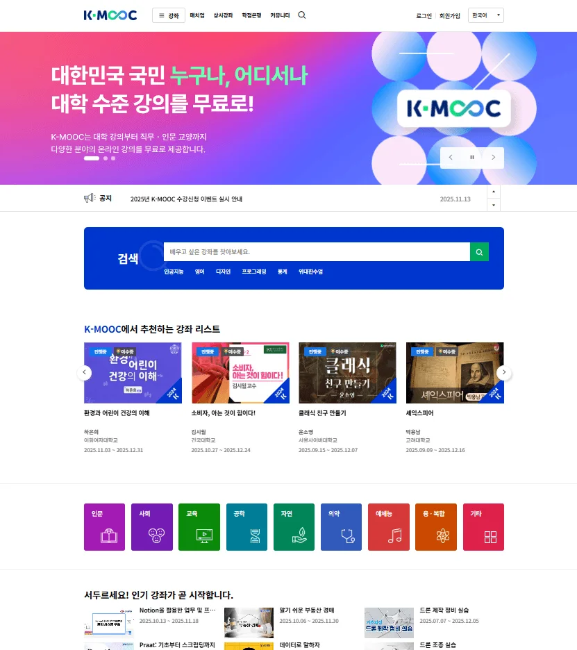 즉, K-MOOC는 단순 ‘무료 인강 플랫폼’이 아니라 대한민국 평생교육 체계의 핵심 플랫폼입니다.