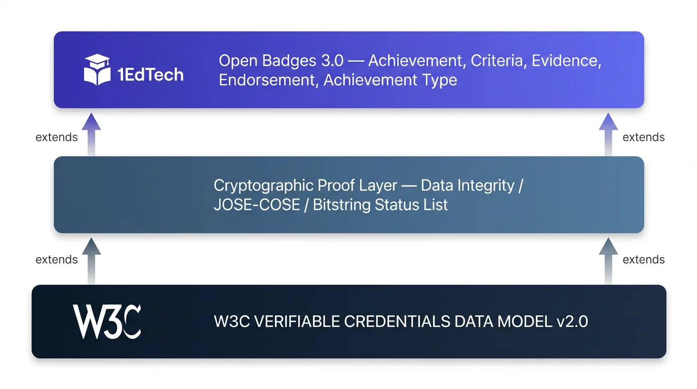 그런데 VC 자체는 "어떤 종류의 인증이든 담을 수 있는 범용 그릇"이에요. 교육 성과를 담으려면 그 안에 넣을 구체적인 구조 — 어떤 성취를, 누가, 어떤 기준으로 인증했는지를 표현하는 메타데이터 규격이 별도로 필요합니다. 오픈배지 3.0이 바로 그 역할을 합니다.
