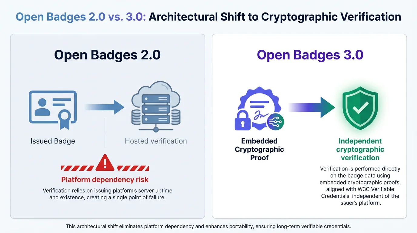 이 중에서 교육기관 실무에 가장 큰 영향을 주는 변화는 신뢰 모델의 전환입니다. 2.0에서는 배지의 진위를 확인하려면 발급 플랫폼의 서버에 접속해야 했습니다. 플랫폼이 서비스를 중단하거나 데이터를 변경하면, 이미 발급된 배지의 신뢰성도 함께 흔들리는 구조였거든요.