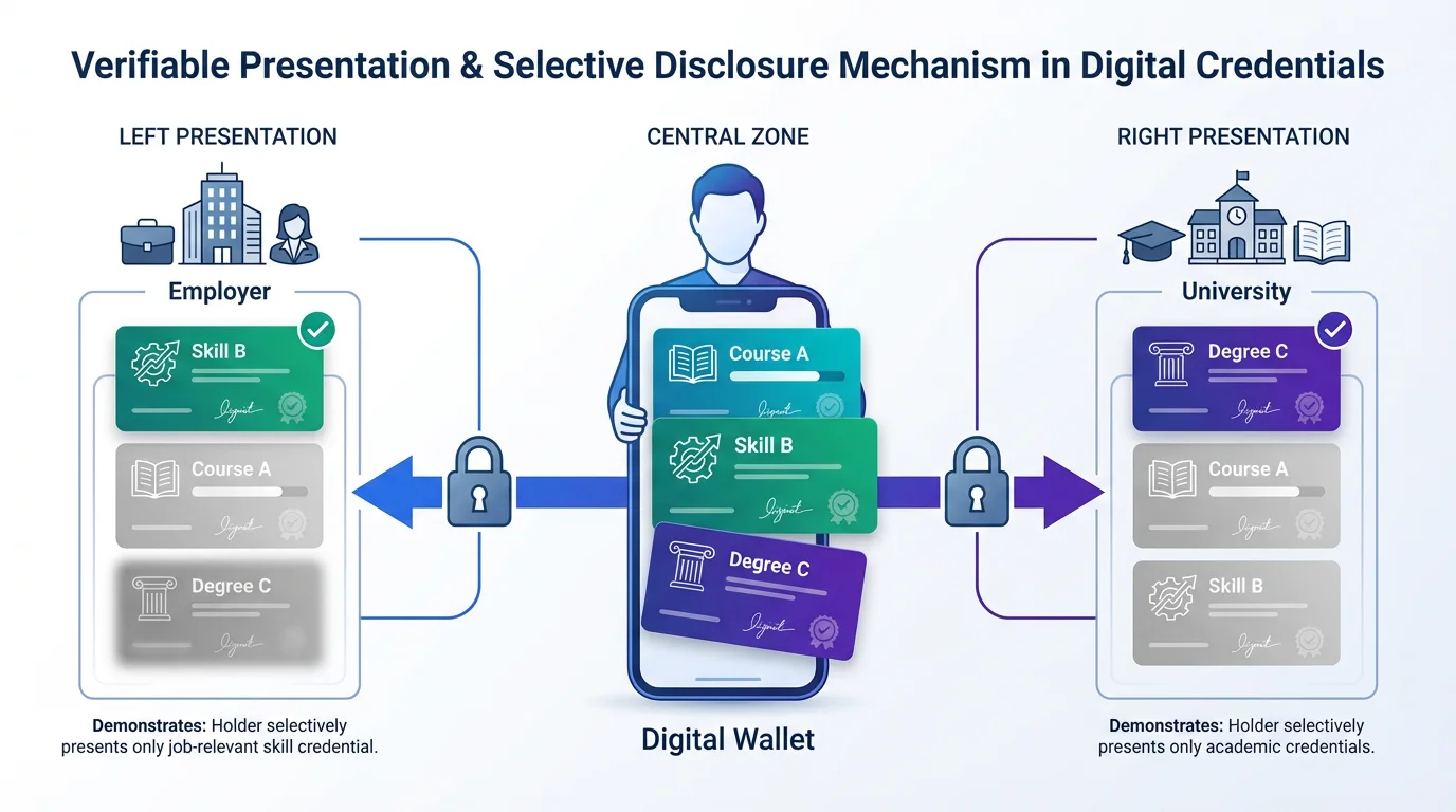 첫 번째, 학습자 중심의 데이터 소유권. 2.0에서는 배지가 사실상 플랫폼에 "보관되는" 구조였습니다. 학습자가 플랫폼을 떠나면 배지 접근이 어려워지는 경우가 있었죠. 3.0에서는 학습자가 디지털 지갑에 배지를 직접 저장하고, 원하는 곳에 제출합니다. 20년 후에 발급 플랫폼이 사라져도 배지의 검증이 가능한 구조입니다.