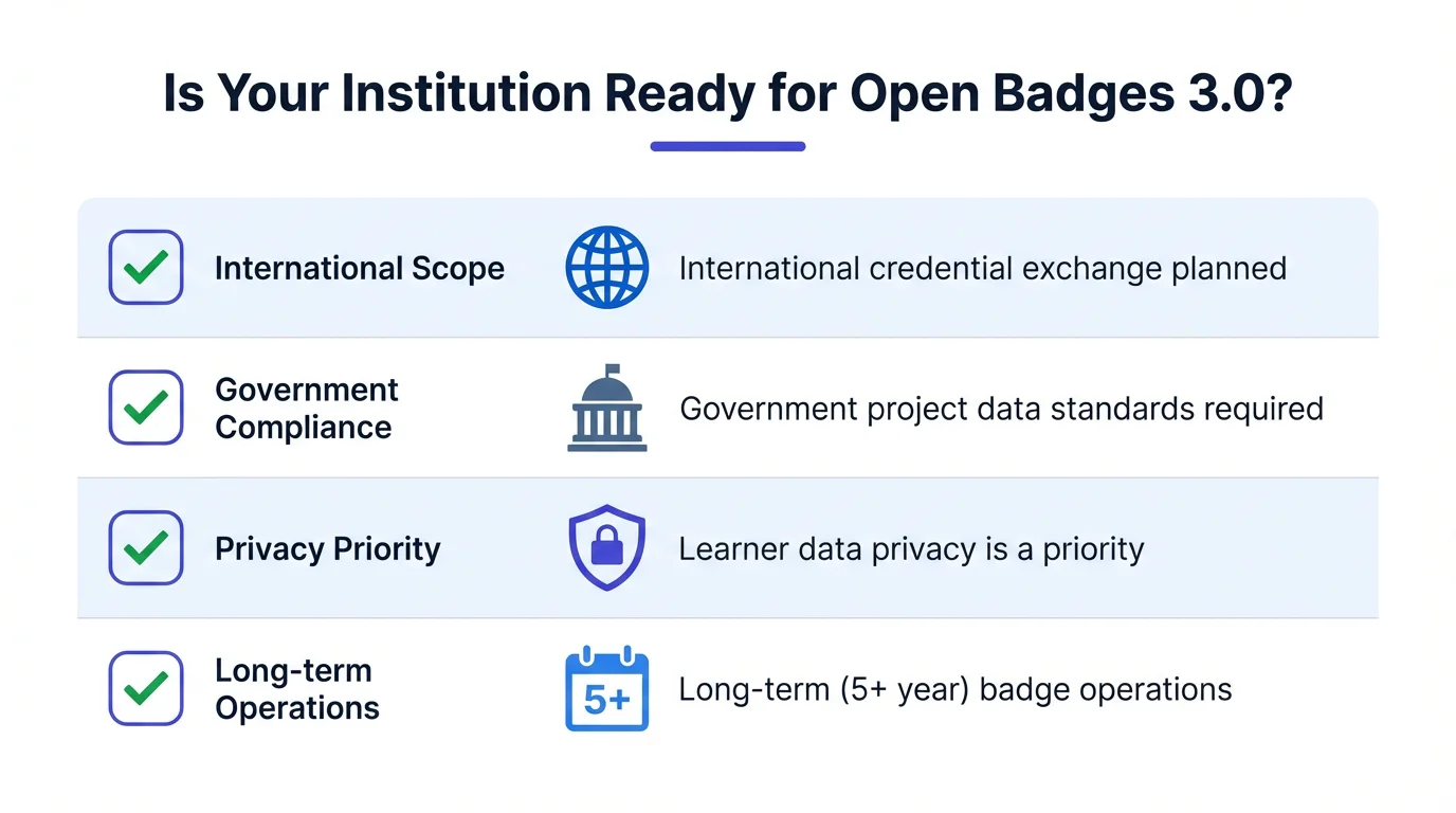 해외 대학이나 기업과 인증을 교류하거나 향후 계획이 있는 경우. 정부 사업 성과 증빙에서 표준 메타데이터 기반 데이터 연계가 요구되는 경우. 학습자의 개인정보 보호와 데이터 자기결정권이 중요한 사업을 운영하는 경우. 그리고 디지털배지를 5년 이상 장기 운영할 계획이 있다면, 플랫폼 의존도를 줄이는 3.0의 검증 모델이 리스크 관리 차원에서 확실히 유리합니다.