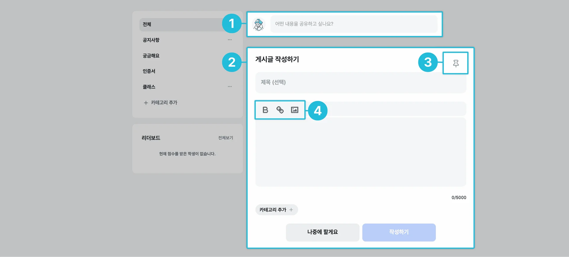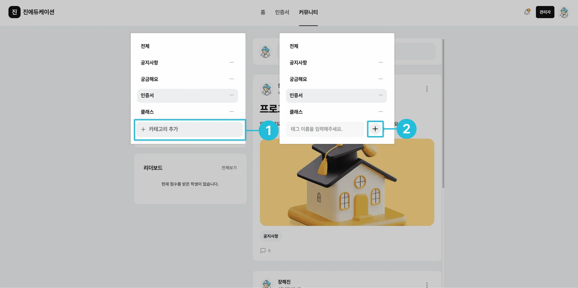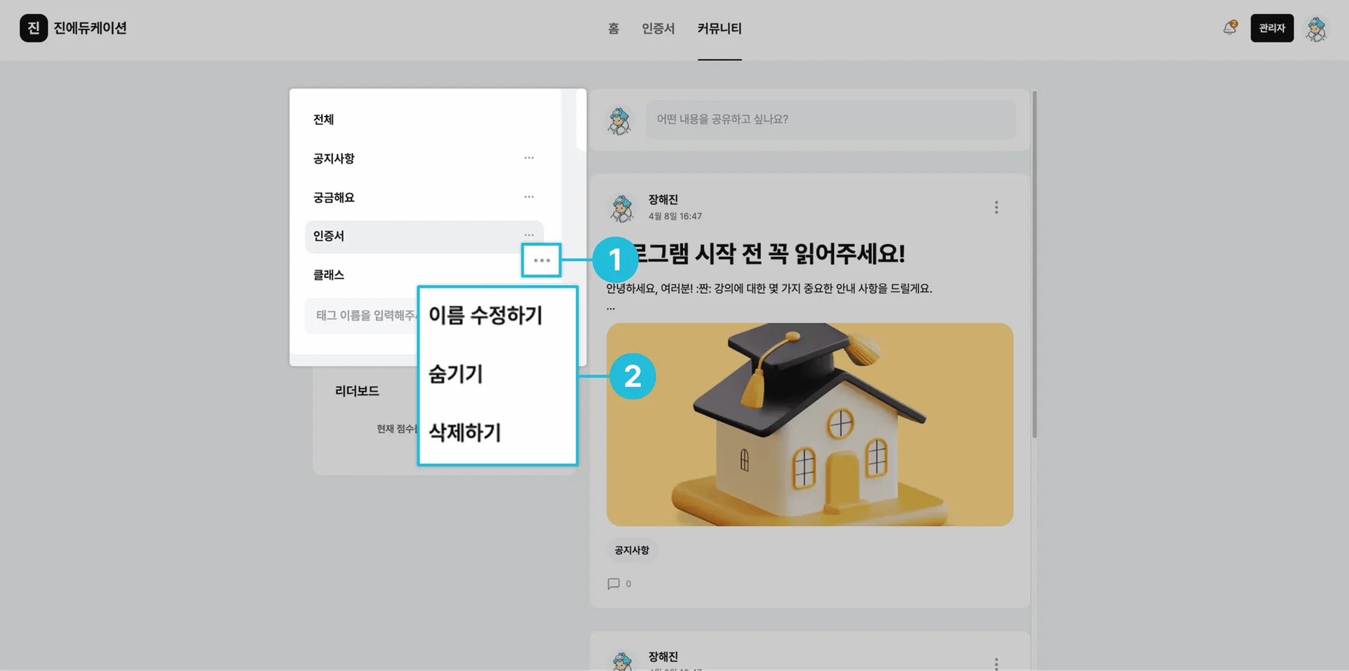 (단, ‘인증서’, ‘클래스’, ‘공지사항’ 등 기본 카테고리는 삭제할 수 없습니다.)