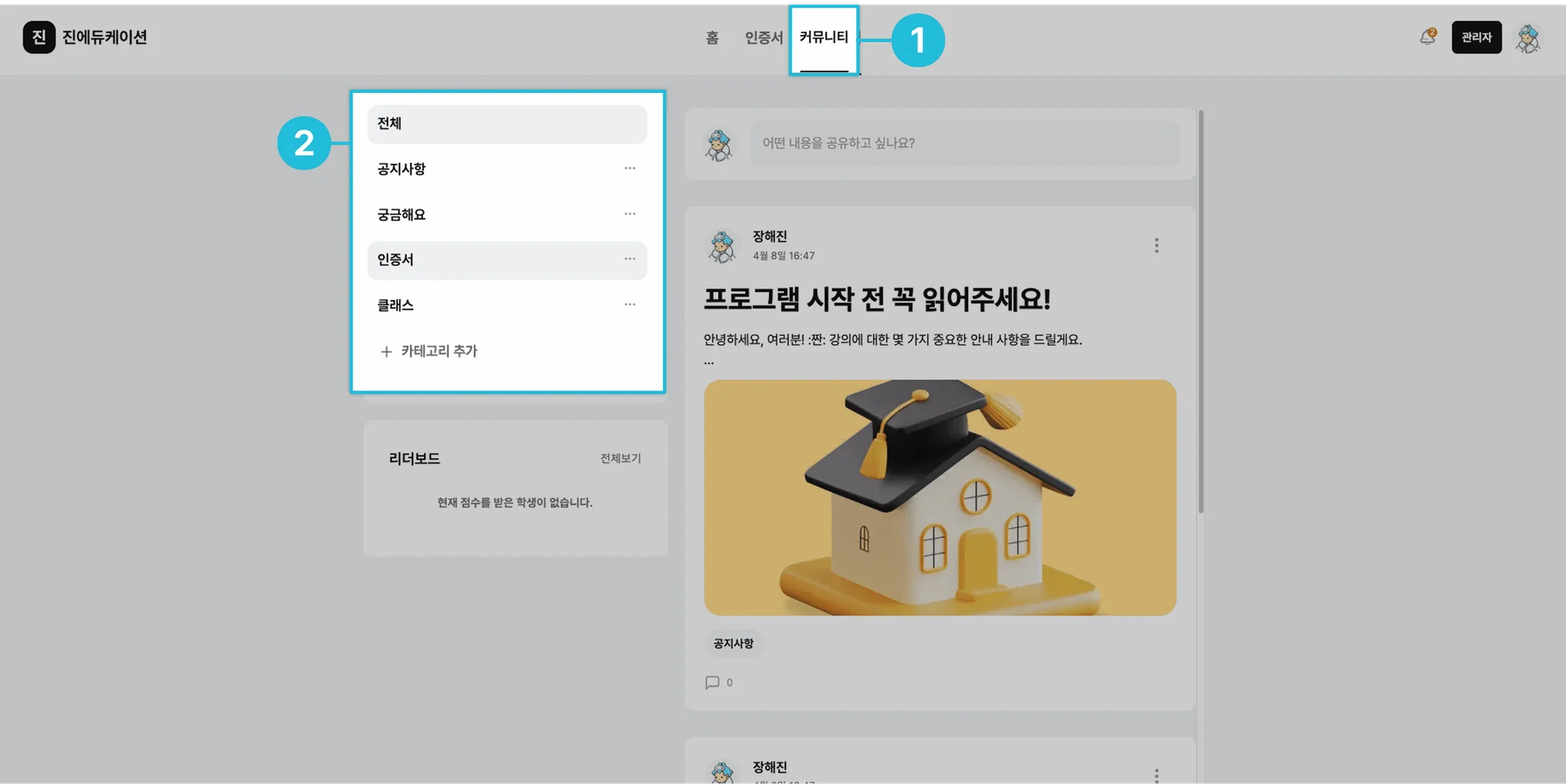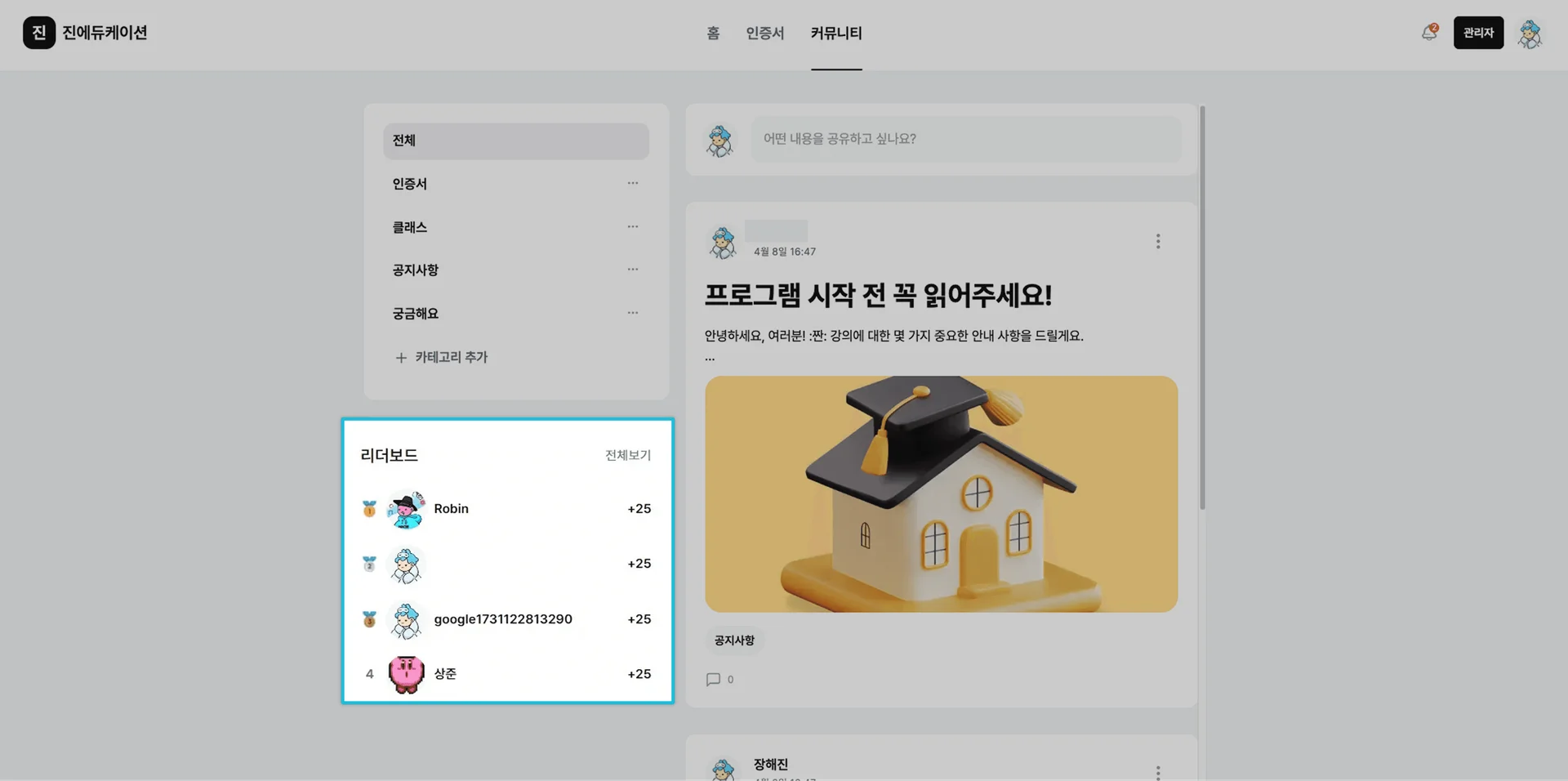리더보드는 학습자의 클래스 미션 완성률을 기준으로 자동 생성되는 순위 목록입니다.
