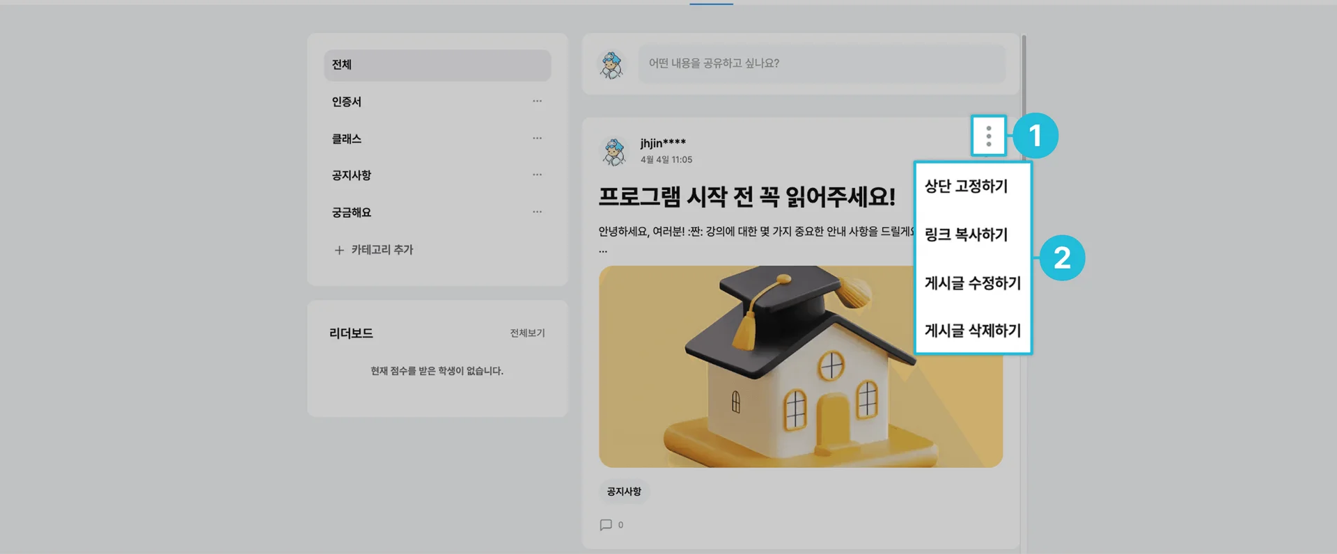 상단 고정하기: 게시글을 해당 카테고리 상단에 고정합니다.