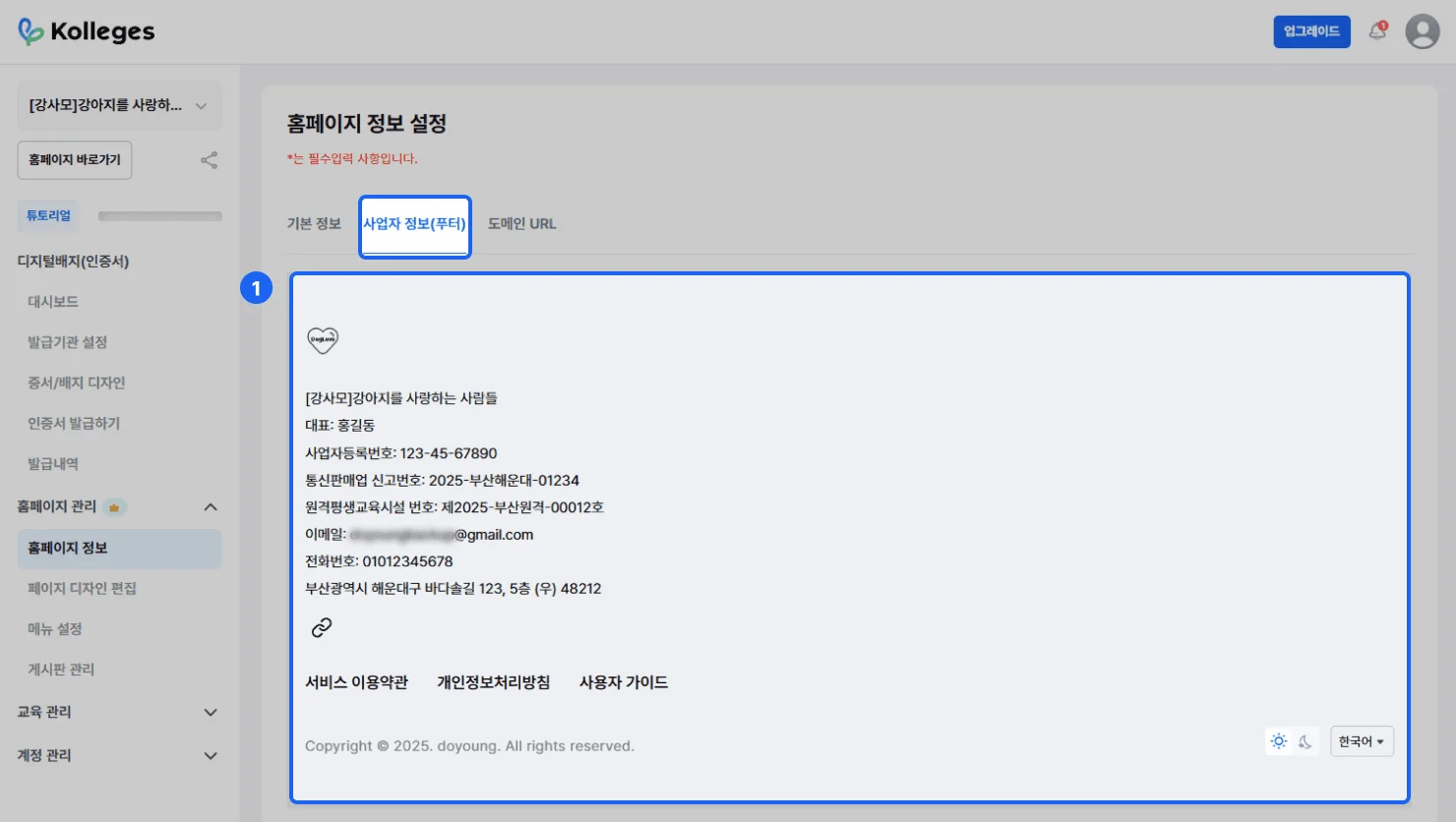 [홈페이지 관리] > [홈페이지 정보] > [사업자 정보(푸터)] 탭에서 홈페이지 푸터 정보를 설정할 수 있습니다.